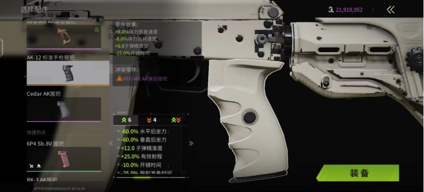 握把——优选AK-12标准手枪握把,下位替代有FKG MG AK兼容握把(适合开镭射后找不到准星、需要快速开镜的玩家)和MH-73标准握把(适合喜欢持枪冲脸对枪的玩家)。