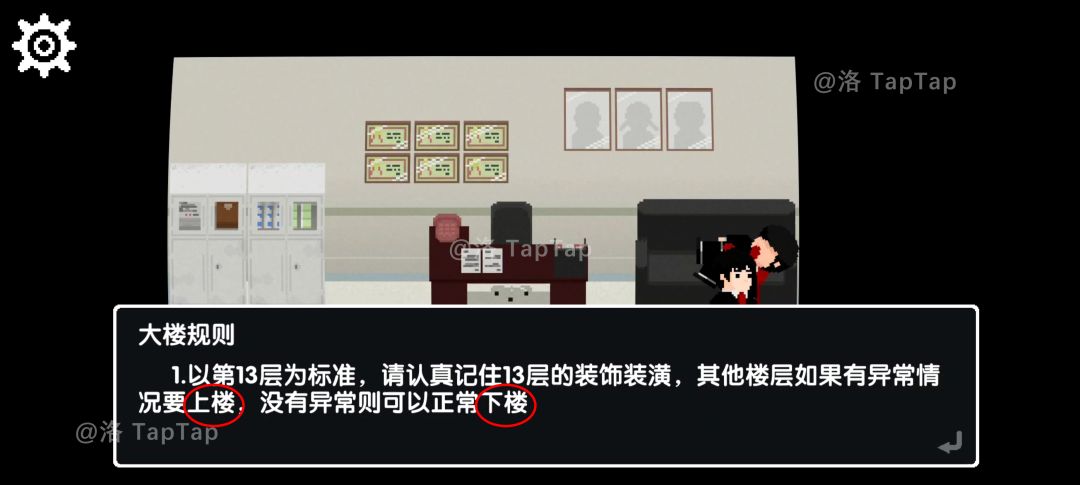 “异常楼层上楼,非异常楼层下楼”,如何上楼,如何下楼?在按下红色按钮后,走廊两端的卷帘门会开启;边上有逃生出口标识的楼道为下楼,而走廊另一端没有标识的则为上楼。