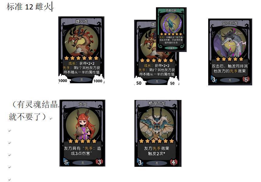 13雌火、12雌火嘲讽装备都架给1号位雌火,单论身材先手龙很少有对手,主要内战挡灾厄的作用,对策牌主要靠灵魂结晶处理,另一个原因是龙女是从前往后结算靠前的更容易吃傀儡(让他一个人同时面对傀儡鱼人双威胁)就算吃了对策仍然保留有灾厄雌火的作战能力,。