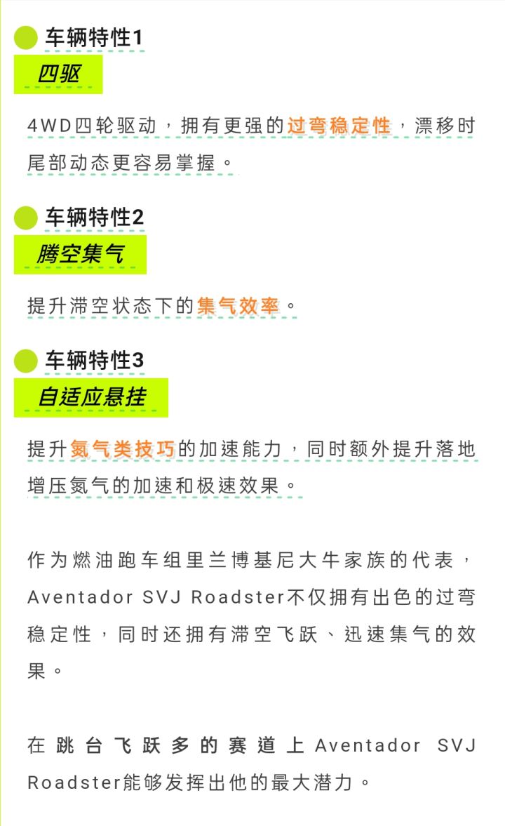 1、首先就是图片里新出的兰博基尼,说句实话我看到这个属性还是比较失望的,我不想多说希望官方能让新限定车数值超模一些(不要把属性搞的跟电莲花一样然后数值还相差无几)