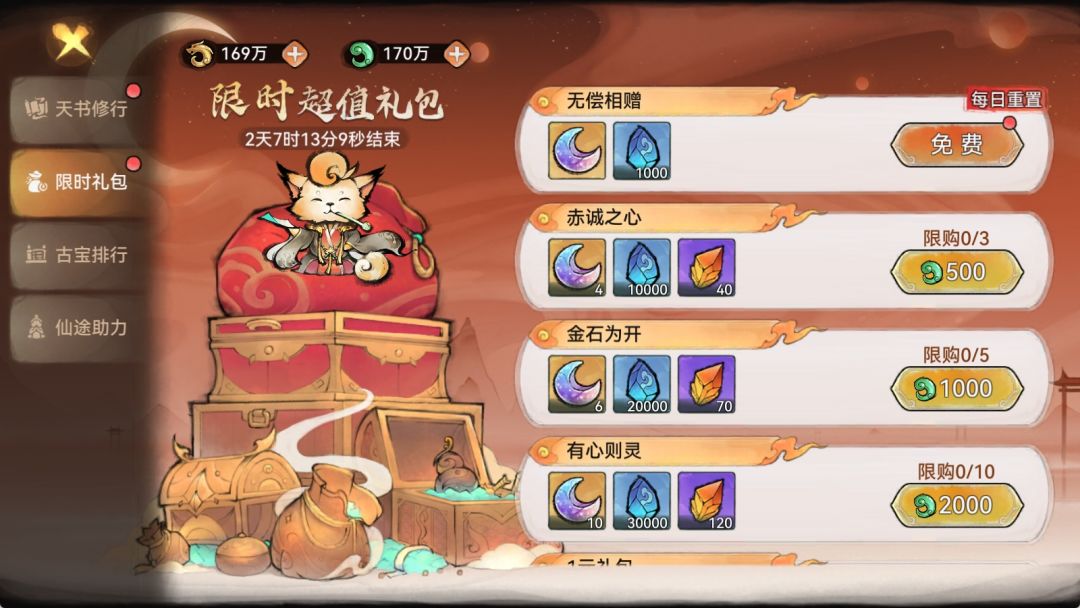 在【限时礼包】中,会开启不同额度的限时特惠礼包供祖师购买,以获取月玄石。