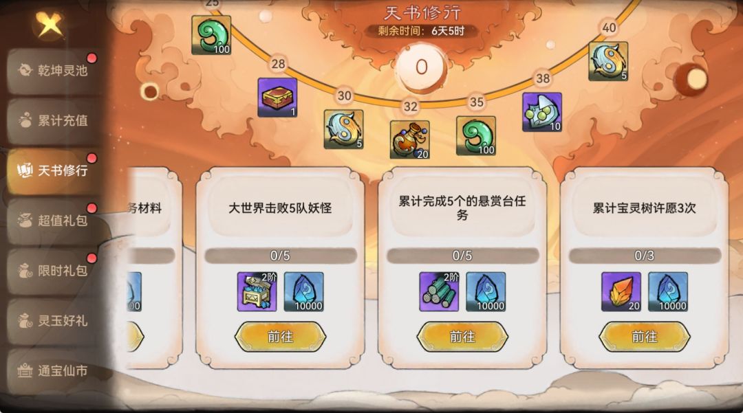 活动期间,祖师通过完成天书任务可获得灵玉、古宝升星石等基础奖励,完成指定数量的天书任务还可以额外领取乾坤币、灵玉、天云纳灵丹等阶段达标奖励。
