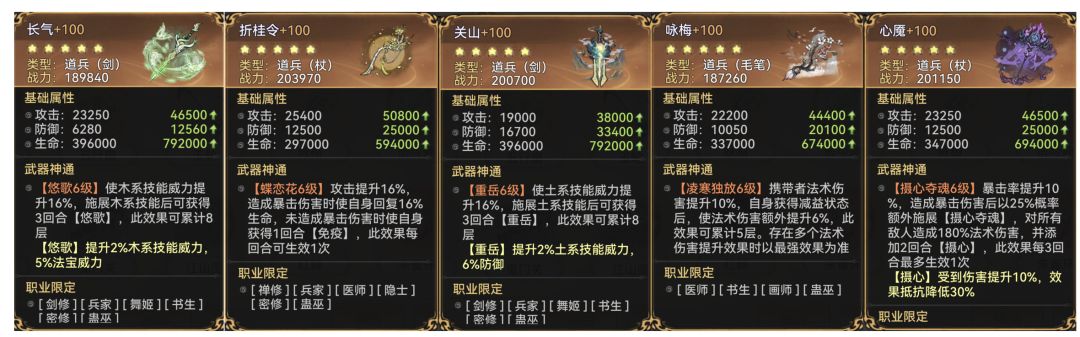 设计定位不明晰导致用处十分尴尬的道兵,既然给予的是攻击力加成那就期望是主 c 携带,然而给到的增幅是回血+免疫效果,看着很美好但实际会让主 c 处于伤害不足、也拉不高身板坦度的尴尬局面,唯一就是让箫辰携带确保其稳定提供辅助增益,但箫辰又有【月满今宵】、【蛟珠】、【星河日暮】等好几个上位选择,所以折桂令就还是老实放在图鉴里吧。