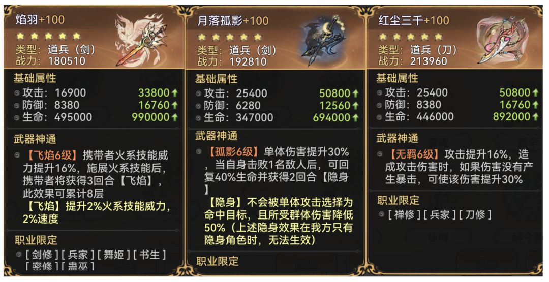 一把定位比较尴尬的道兵。虽然增益是固有被动并且能提升巨额伤害,但其设计的初衷是提高无暴击的输出期望,因此【禅修】【兵修】基本无缘。【刀修】的职业技能【断岳狂刀】/【因果斩尽】不产生暴击特性能很好地配合【红尘三千】的伤害增幅,因此天金刀、天土刀是比较适配的携带弟子。目前理论上比较好的搭配是天土刀带【负岳剑诀】+【元磁刀谱】,以牺牲暴击率为代价打出巨额伤害。至于卫寒有【孤途】【鬼门关】等上位选择,只能说【红尘三千】的玩法有待开发而且成型成本较高,暂且排在 t2 行列。