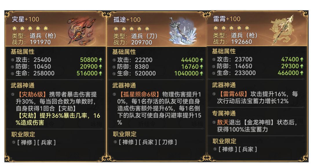 诠释暴力美学的道兵,神通只专注提升暴击伤害,纯粹却强力,而每个单数回合自动赋予的【灾劫】更是提供高额的暴击率和伤害加成,完美提升伤害上下限。职业限定虽然是【禅修】和【兵家】,但其实就是【兵家】的专属(因为禅修的输出靠的是防御力加成)。得益于战帖类功法【囚龙战典】、【煞刑战帖】、【刑天舞戚訣】的强势,任何对应天灵根兵修配上【灾星】绝对是 1+1>2 的存在(尤其是对于有 100% 暴击加成的【囚龙】),能很好地弥补兵家攻击力成长较低的缺陷。