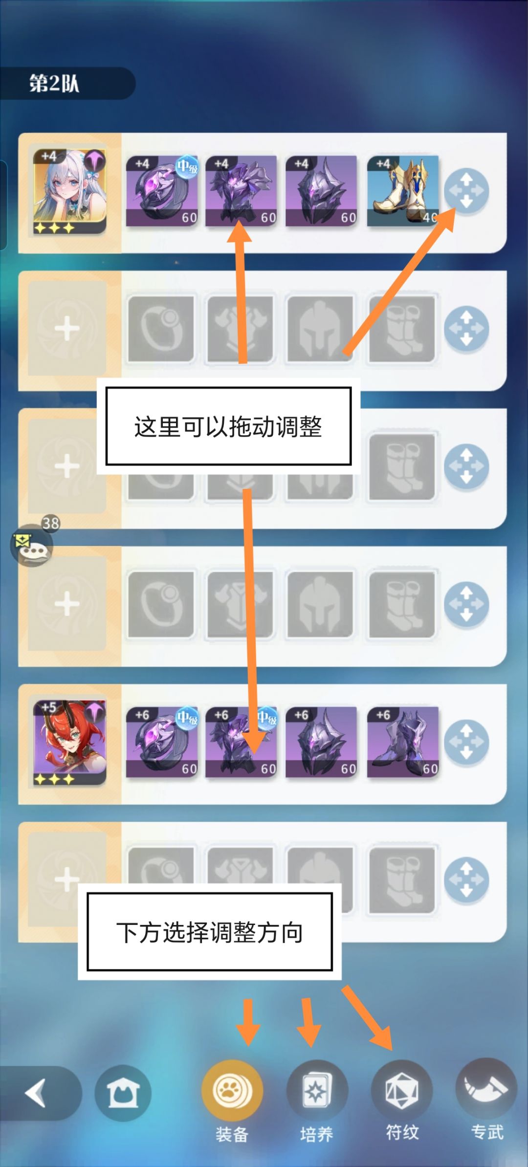 2、各位朋友布置阵容时记得调下装备,符文和突破等级,都是可以调的,不过很麻烦,不去调傻游戏会给你输出带防御套符文或者直接没有,另外这里只能调整各小队内的,第一二三队之间的互换需要回到主界面的小队那里换人后才能换