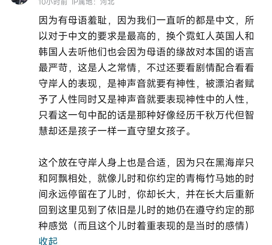 有人提到中配声音应该接近王者荣耀的嫦娥和海月,要具备神明的感觉。