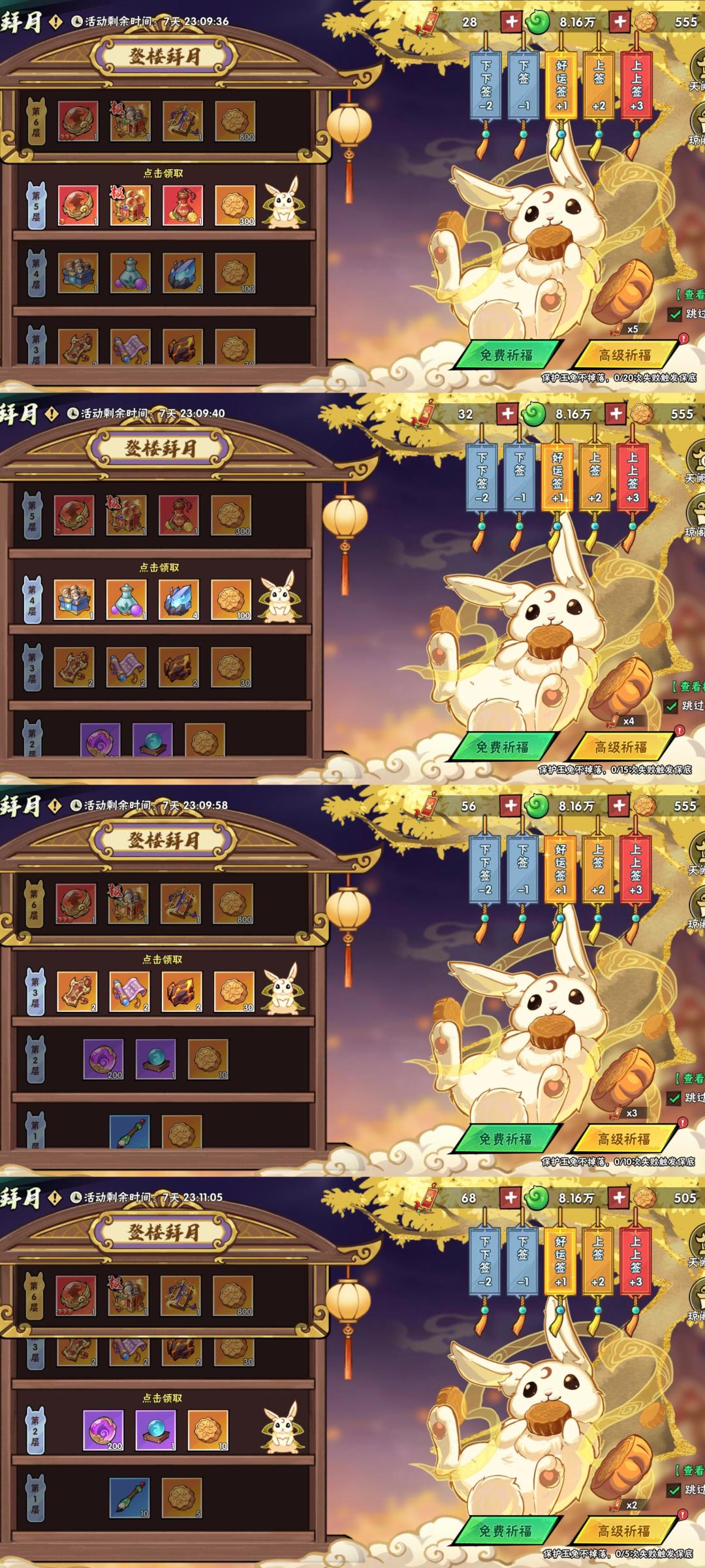 二是每次只到第二层。免费祈福到第三层的几率低,越往上爬消耗越多,只拿第二层奖励也不错。缺突破丹的可以爆突破丹,缺紫色丹药的这次爆紫色丹药是个好机会,也可以只爆10月饼,用来兑换商品。