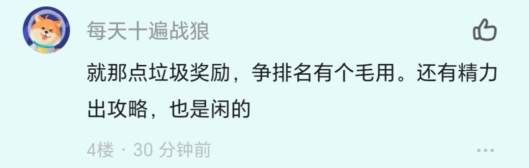 3,2048这种活动有玩家认为做攻略鸡肋排名也没啥用。当初隔壁游戏大伙玩的时候,出2048也这样奖励忽高忽低,后面逐渐增加了活动的比重,最后面大奖奖励是彩色等级的道具奖励,氪佬花钱砸,花钱找人代打,毕竟只有第一才能拿。所以大明星这次奖励垃圾,下次可能就让玩家们争个头破血流,毕竟植入这么个玩法也花了大力气的很可能不会让它闲置,早点深入也少吃点亏。