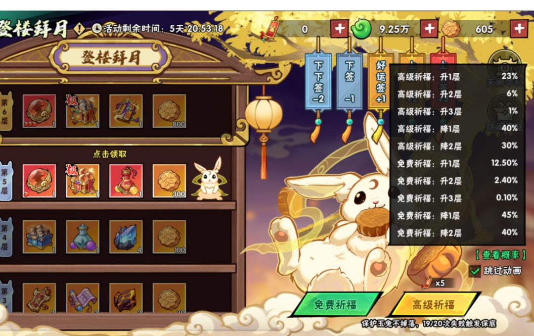 也可以在第二层用免费祈福赌到第三层再用祈福签。在下实测,每次赌免费祈福,不是那么好赌的,也许是在下太黑了的缘故,几率确实很低,还不如一直用祈福签了。