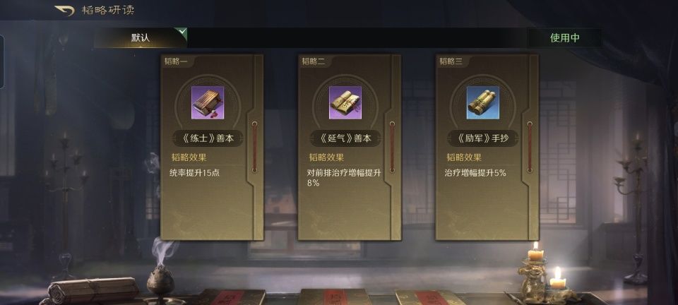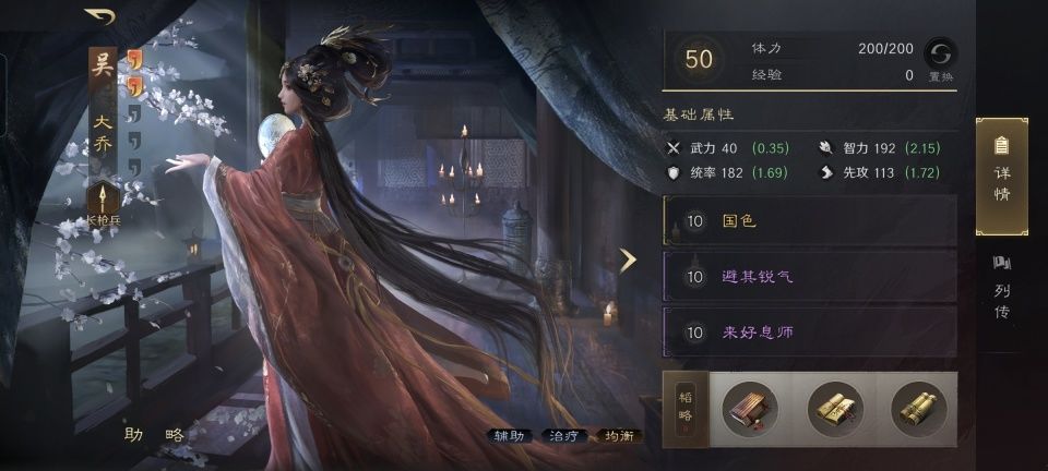 大乔战法:国色+避其锐气+来好息师。韬略库:练士善本+延气善本+励军手抄。长枪兵特性破敌,专精点亮坚定不移。