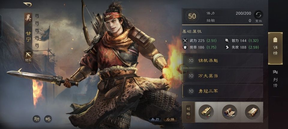 甘宁战法:锦帆渠魁+万夫莫当+勇冠三军。韬略库:劫术(专属)+王道手抄+玄机善本。弩兵特性劲弩,专精点亮釜底抽薪。这里需要注意的是,甘宁的专属金书会屏蔽追击战法,所以只能学习万夫莫当和勇冠三军这两个被动型的,却依赖普通攻击生效伤害的战法。
