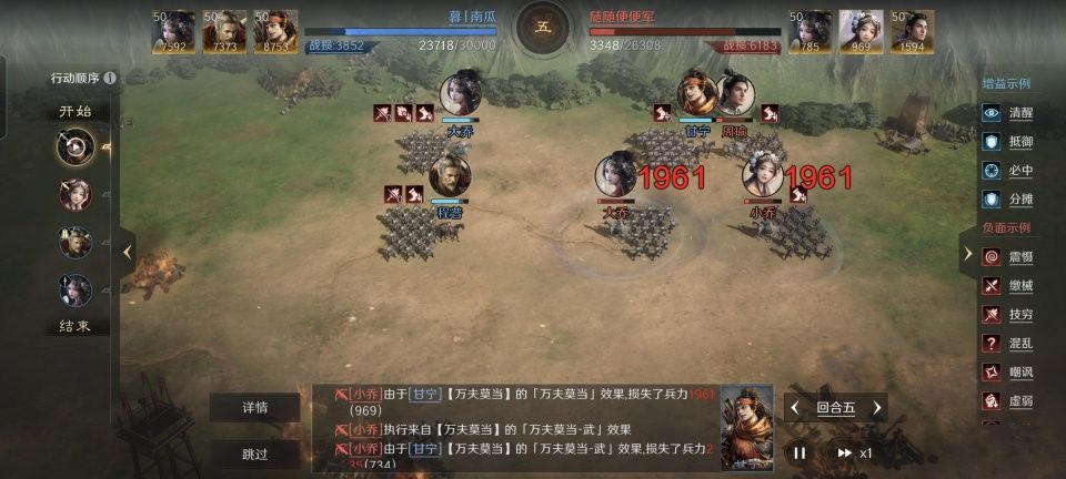 程普战法:兴王定霸+舍生取义+无难之志。韬略库:虎臣(专属)+抵力善本+兵令善本。重盾兵特性不屈,专精点亮屹然不动。大乔和程普两人都身处方圆阵的前排,故而都获得了5%的减伤保护。大乔侧重治疗和保护,尤其是来好息师,能够精准治疗她和程普。在兴王定霸的基础上,程普也是豁出去了,舍生取义和无难之志总共给甘宁额外增加了75%的连击率。作为全队武力值最高的甘宁,他还从程普这里获得了清醒和倒戈。