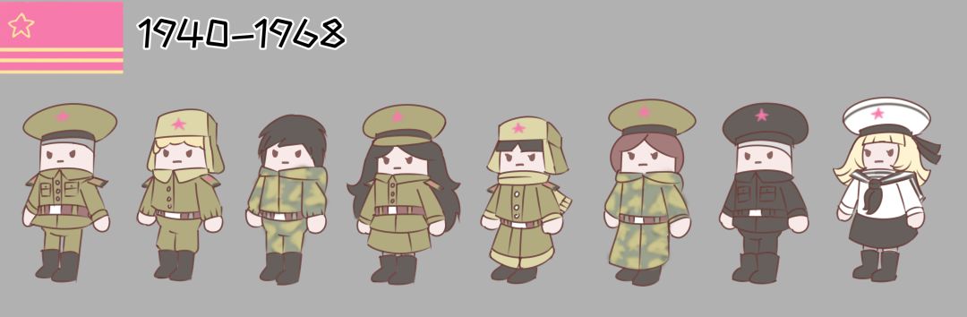 苏维利亚军队武装力量,在1950年到2003年,军队服装科技在与世界与时并进的同时,也保持着特有复古式风格,在这53年的变化中军队服装大抵可以分为三个阶段: