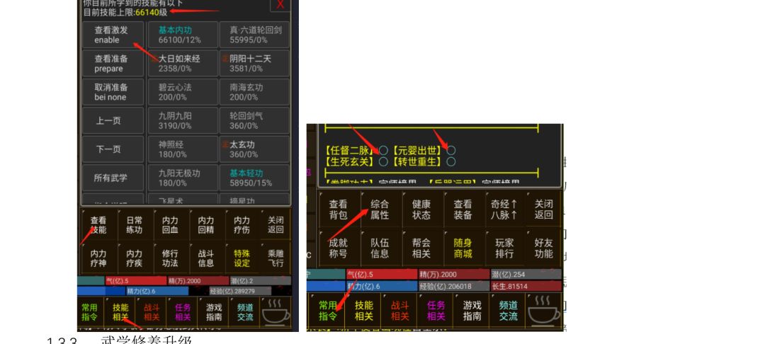 或点击技能相关-日常练功-武学修养练功提升,此方法只能在线练功升级,速度较慢,无法quit挂机提升(极不推荐);也可购买神魄商城的武修丹 (50000 魂 )使用提升,此法可以使用指令挂机无限用,无提升上线,无使用cd。