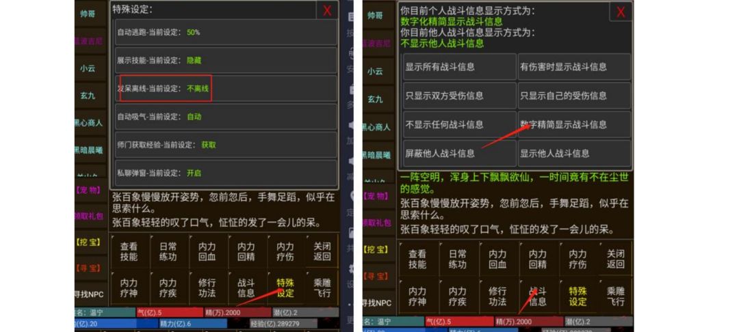 在特殊设定处设置发呆不离线精简化显示战斗信息,战斗信息中设置数字精简显示战斗信息。