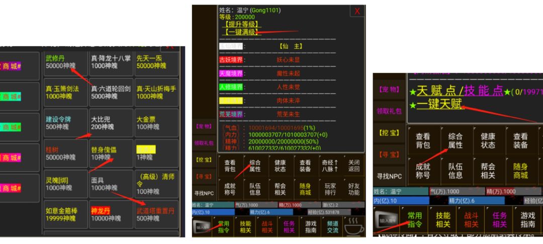 丹药系列,天性丹、变性丹、正气丹、邪气丹、静心丹都可以随便吃,洗心丹最好不要吃,会清除所有门派技能,需要叛教可以在神魄商城买高级清师令。其中太玄经可用于解密阴阳十二天,可购买使用。