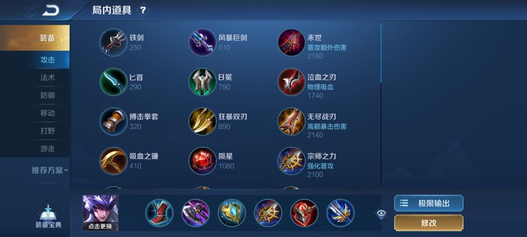 这一套是很多主播职业选手都在用,满级32攻速,前期伤害会比别的低,但是好在即使对面出了不祥征兆或者对线出了守望者铠甲也不容易卡枪