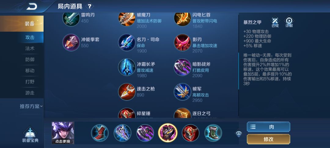 爆裂铠甲,最大生命值由1000变为900,增加30点攻击力,增加5%移速,被动由原来的每层叠2%伤害提升和2%移速提升改为每层2%伤害提升和1%移速,最多叠加5层