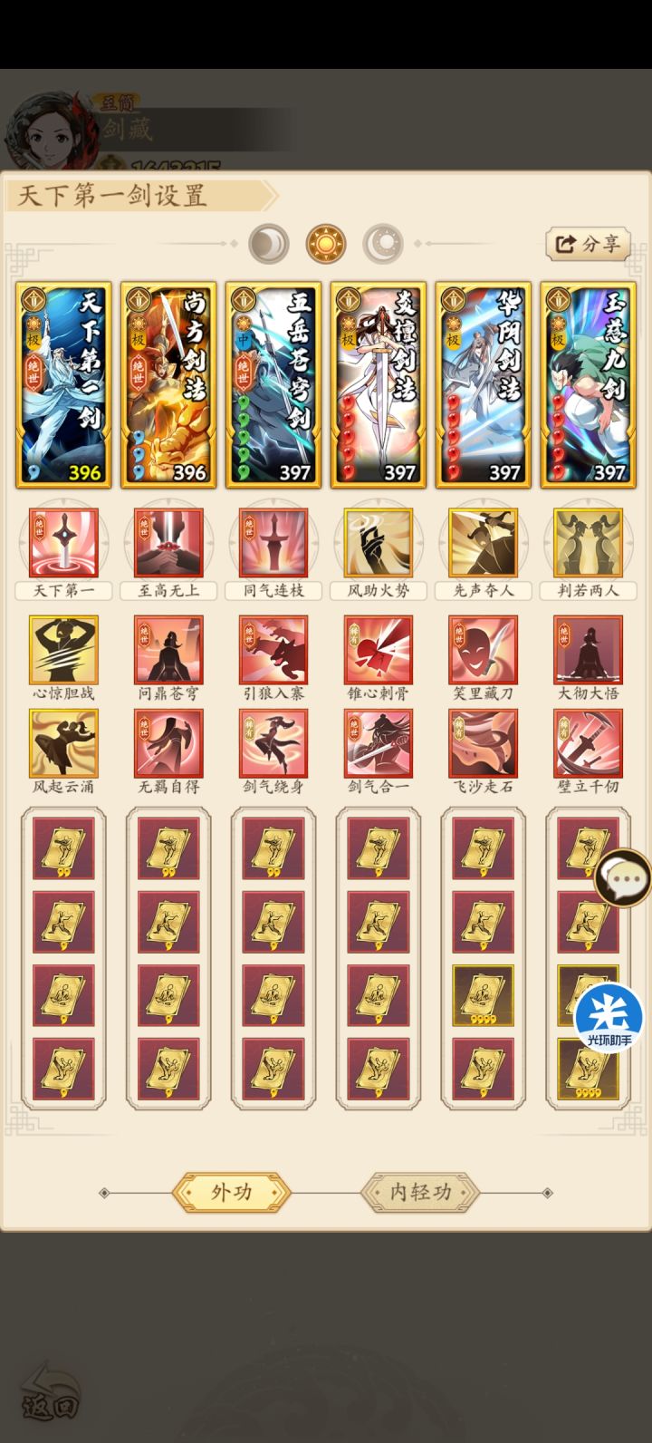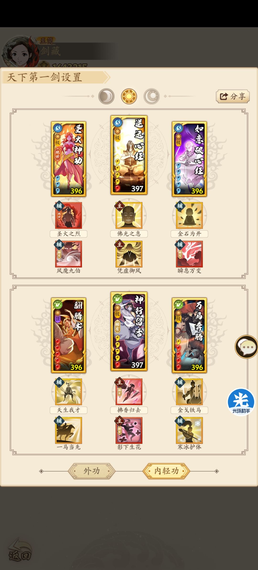 第一套是倚天带法,我个人是不带华山五式的。因为华山五式太后期了而且是稀有不好追勾,并且阳剑重要的不是吸血是伤害。因为我的八区铜墙比较多,阳剑最大克星也是铜墙,所以连击比较重要,每一剑都能打出上限的话连击就是百分之四十的最大血量了!当然了如果华山五式勾高可以替代炎壇,太极剑势不能少的,因为要吃剑气绕身的buff!这是第一套倚天阳剑,连击比较高还能破警惕,内功的云体是为了打调和解麻痹,我勾低所以选择辅运。勾高的话可以选择主运,有先手有增伤,后手的话打调和剑还能解麻痹让倚天出手!第二套是天下第一剑不要倚天的套路,这一套的话也是可以打铜墙,如果自身勇猛多的话还可以有不错的灼烧伤害跟附加武学伤害,当然了这一套暴击会比较高,连击没有那么稳定,主要看自己区情况取舍,如果自己区没有很多主魅影的阳刀阳枪一二套都可以用,反之的话就用第一套!