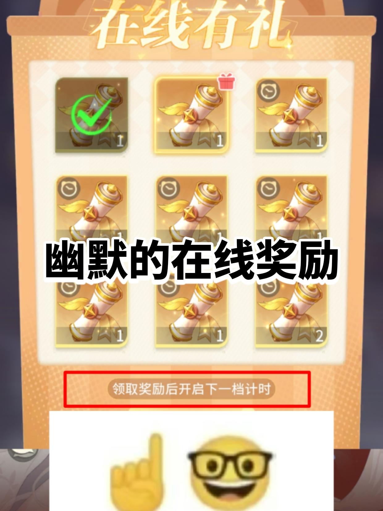 提一嘴那个幽默的在线奖励,我记得是6分钟领一次,一共是9档,这玩意儿你想一直挂着还不行,必须把前一档奖励领了才开始计算新的在线时长,你推个图爬个塔要是忘领了,就是纯纯小丑![[表情_丑竟己]](https://img.tapimg.com/market/images/c5a8216903140825d6cff93e037f52e0.png)