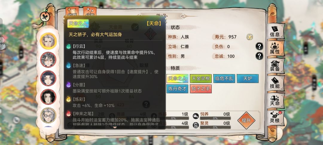 部分弟子天命赐福有“乘风”“云行”,可以提高弟子速度属性。