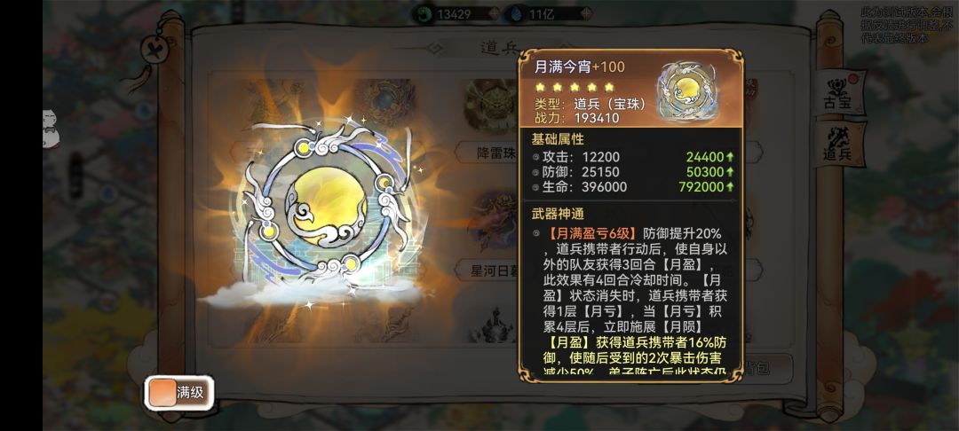 防御提升10%(满级20%),道兵携带者行动后,使自身以外的队友获得3回合【月盈】,此效果有4回合冷却时间。【月盈】状态消失时,道兵携带者获得1层【月亏】,当【月亏】积累4层后,立即施展【月陨】。