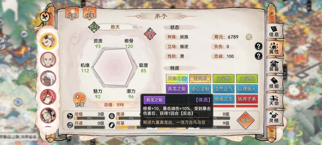 部分弟子拥有特殊体质,自带暴击减伤属性。比如敖天独有的真龙之躯,可提供10%的暴击减伤以及受到暴击时获得1回合反击的效果。