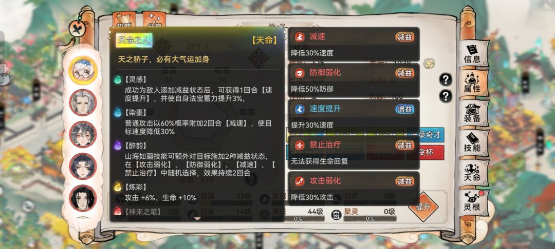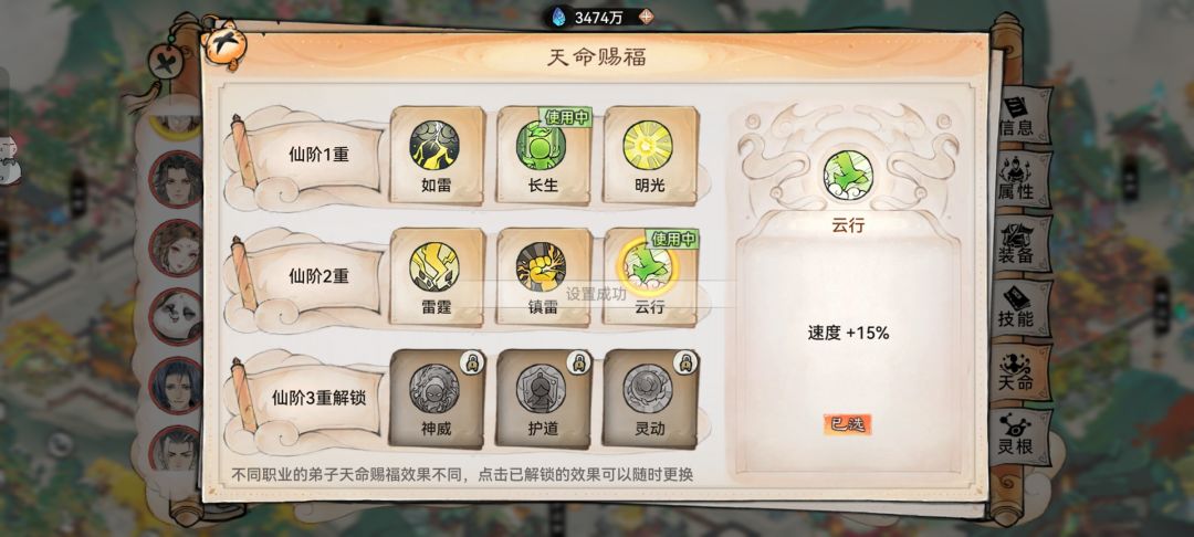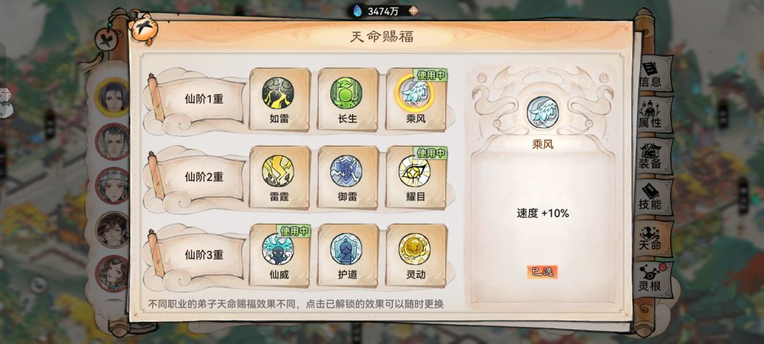 部分弟子天命赐福有“乘风”“云行”,可以提高弟子速度属性。