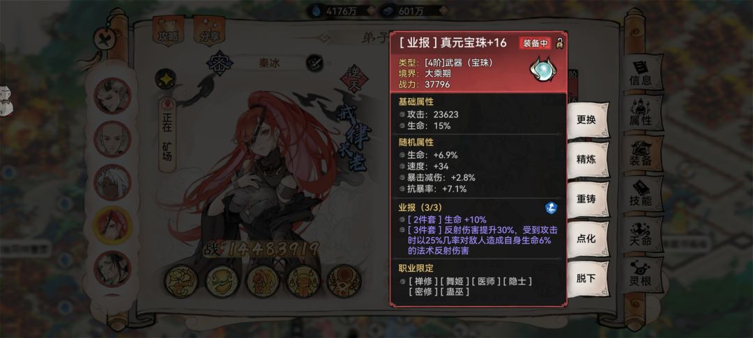 6、密修。适配指数☆☆☆,普通密修与隐修类似,现版本没有出头之地。密修仙缘弟子目前是秦冰和紫灵,这两个弟子更需要生命值提升类的道兵,比如红棘,所以,痧哥建议在没有红棘的情况下密修可以勉强携带“月满今宵”。