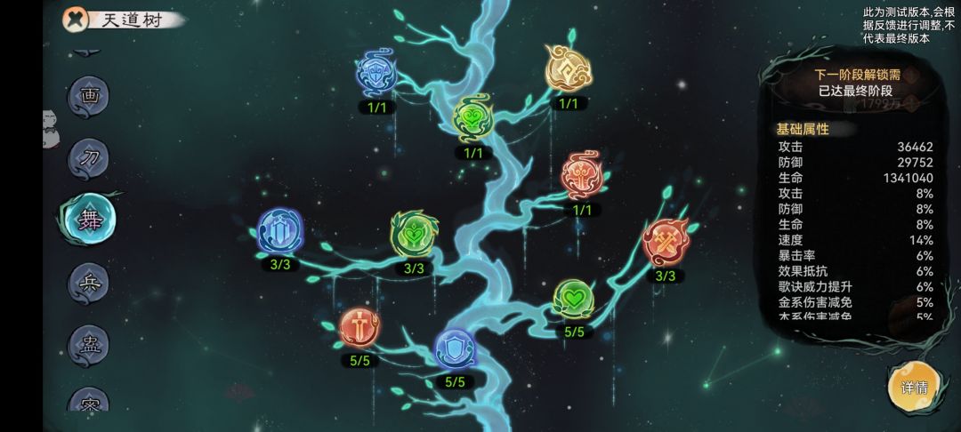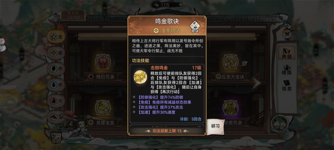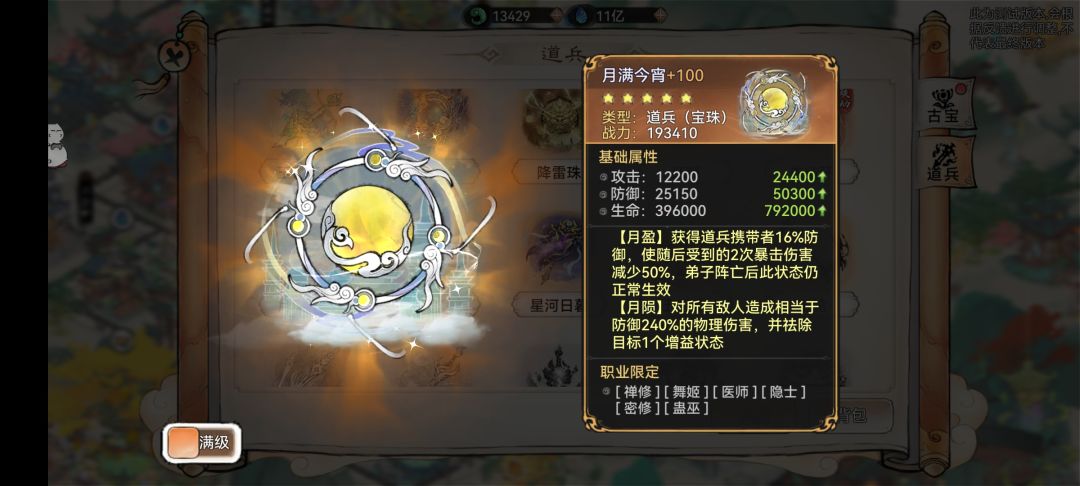 【月盈】获得道兵携带者6%(满级16%)防御,使随后受到的2次暴击伤害减少25%(满级50%),弟子阵亡后此状态仍正常生效。