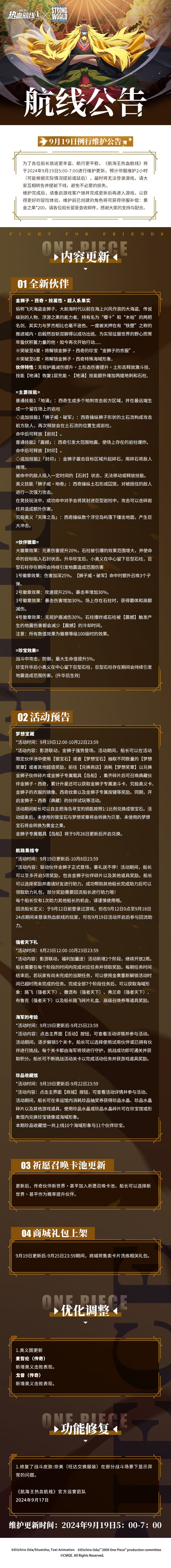 为了各位船长旅途更丰富、航行更平稳,《航海王热血航线》将于2024年9月19日5:00-7:00进行维护更新,预计停服维护2小时(可能根据实际情况提前或延后),届时将无法登录游戏,请大家互相转告并提前下线,避免不必要的损失。