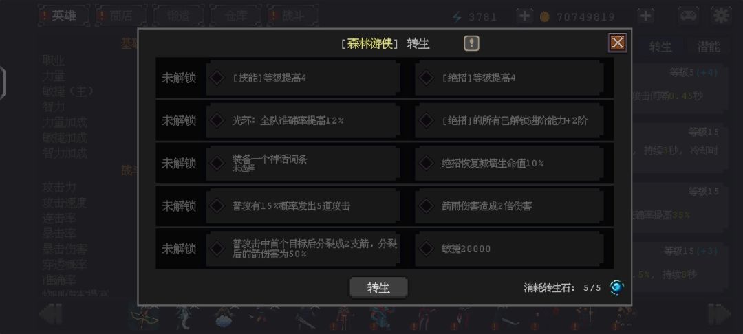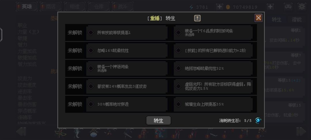 0.6.0版本增加的转生,升到60级后消耗转生石可转生一次,获取额外能力,每个英雄最高转生5次。