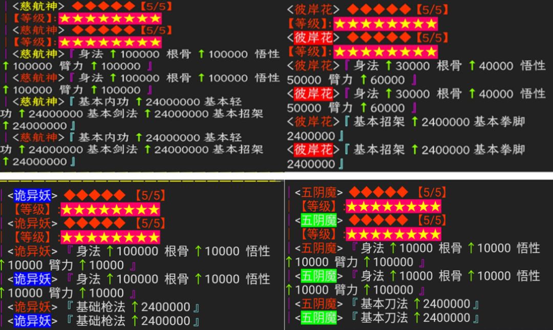 注意:以上十套宝甲,其中慈航、佛、魔、妖套装在未获取洞天套装时可以收集,作为初期过渡使用;