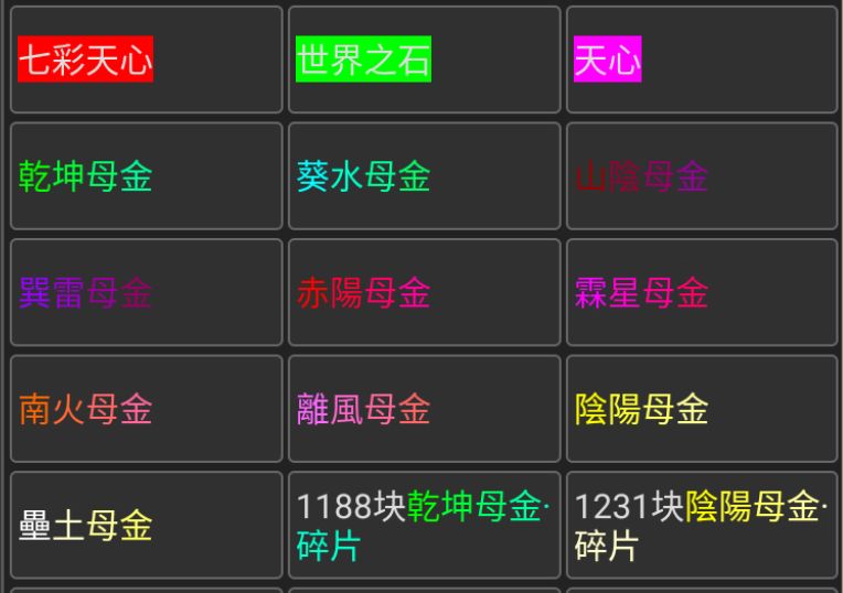 母金有10种,只能打造特定装备。对应关系如下:乾坤剑,赤阳刀,巽雷枪,山阴戟,葵水棍,离风针,南火箫,阴阳斧,垒土掌,霖星指。