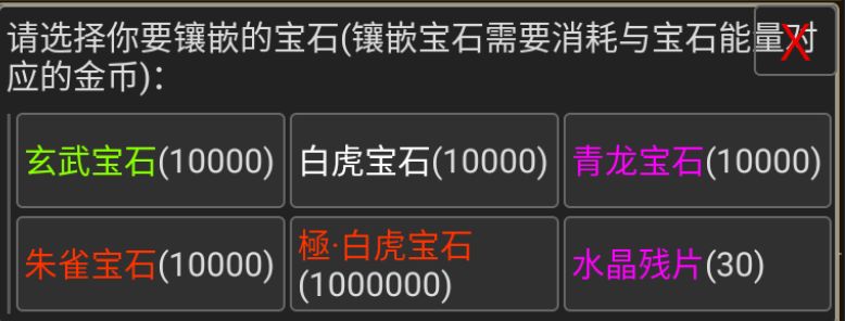 镶嵌2块极白虎、2块极青龙、1块极朱雀、1块极玄武效果