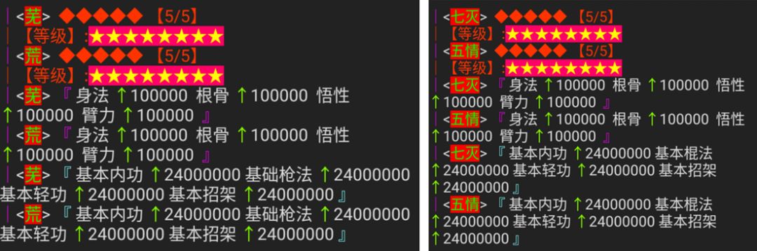 情灭套装:防御力250万,增加后天属性10万,棍法、内功、轻功、招架激发增加2400万。荒芜珍宝阁兑换,暂未开放。