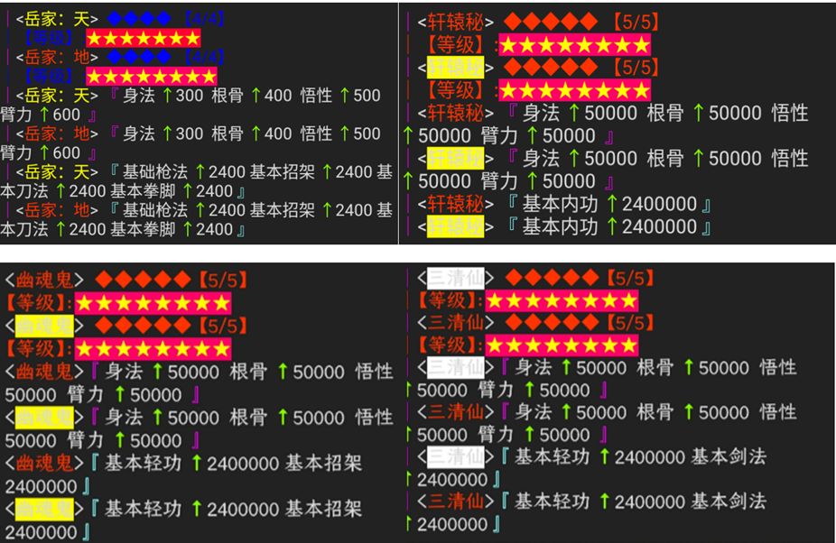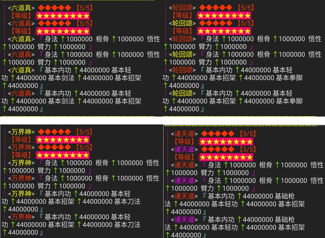 六道套装:防御力250万,增加后天属性100万,剑法、内功、轻功、招架激发增加4400万。