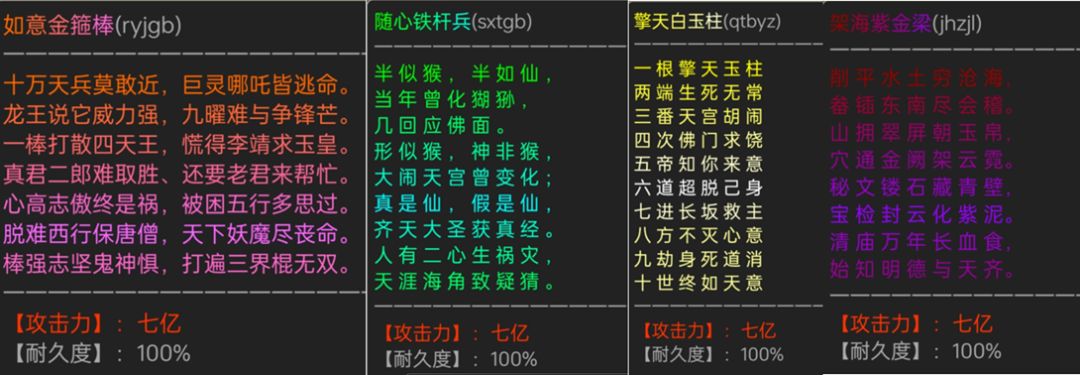 如意金箍棒、随心铁杆兵、擎天白玉柱、架海紫金梁
