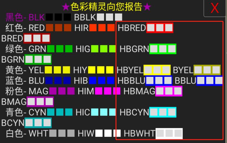 注意,带底纹的颜色用不了,只能用单色。左下角指令框输入color可以查看颜色代码。