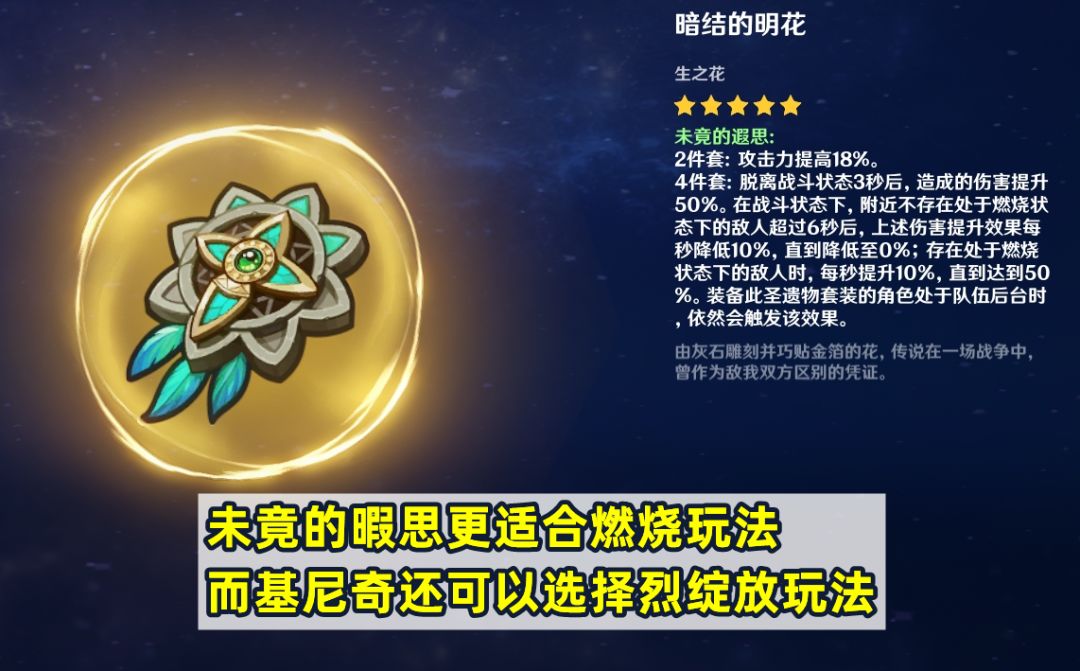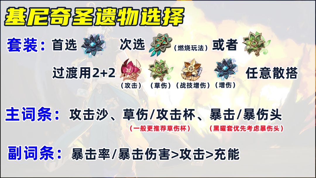 【圣遗物选择】首选黑曜秘典;次选燃烧套“未竟的暇思”或者草套“深林的记忆”。不过要注意燃烧套更适合燃烧玩法(基尼奇还可以选择烈绽放玩法)。相比之下黑耀秘典更泛用,并且有高暴击率加成,更容易凑双暴,因此综合来看更推荐优先选择黑耀秘典。过渡可以使用2+2攻击/草伤/增伤散件搭配。