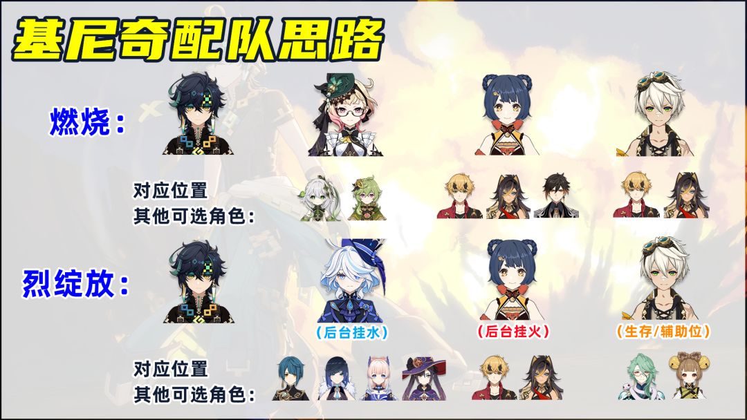 【配队思路】考虑到配合天赋的机制,基尼奇的配队主要分燃烧和烈绽放两种思路。燃烧配队推荐:基尼奇+艾梅莉埃+香菱+班尼特。艾梅莉埃的位置还可以选择纳西妲或柯莱;香菱可以换成托马、迪希雅或钟离;班尼特同样可以换成托马或迪希雅。