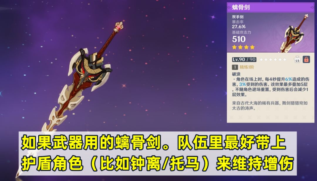 【武器选择】首选专武山王长牙,专武以外推荐三把武器:裁断、苇海信标和螭骨剑。如果选择的是裁断,推荐队伍里带上钟离来触发结晶反应(火+岩),从而触发裁断的战技增伤;如果选的是螭骨剑,同样推荐带上护盾角色(比如钟离/托马)来维持增伤。