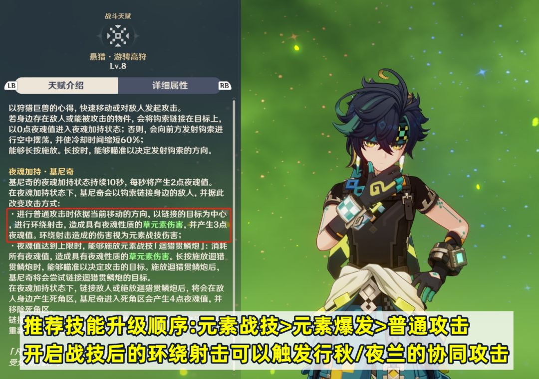【技能简析和升级顺序】推荐技能升级顺序为:元素战技>元素爆发>普通攻击。基尼奇最主要的输出来源就是元素战技的贯鳞炮。另外开启战技后的普通攻击变为“环绕射击”,此时可以触发行秋/夜兰/托马的协同攻击。不过环绕射击依然视作元素战技伤害,伤害倍率也和战技相关,所以优先升级战技即可。然后可以升级下元素爆发补充伤害;普攻则可以不升。