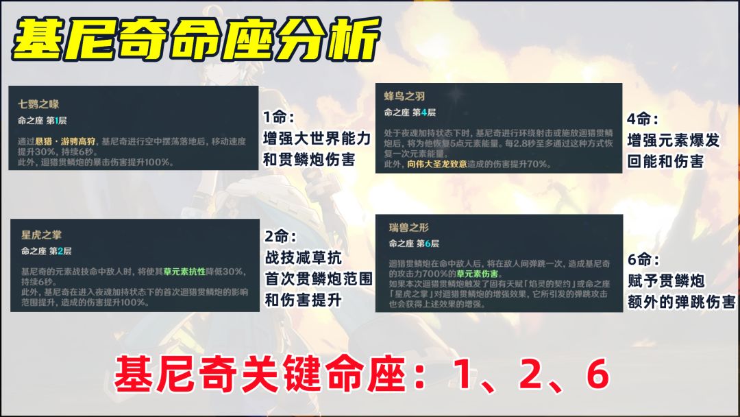 【命座分析和总结】基尼奇的关键命座为1、2、6。1命相当于同时增强了大世界能力和战技的贯鳞炮伤害。2命给战技提供了30%的减草抗,同时更关键的是贯鳞炮的范围和伤害提升。4命主要是给元素爆发提供回能和增伤,相对来说提升不算明显。6命则是赋予每次贯鳞炮一次高倍率的额外弹跳伤害,并且这个伤害还能享受到天赋和命座的加成。