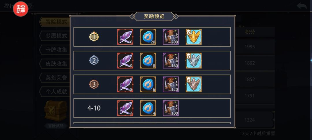 9.半个月一次的冒险和梦魇排行榜奖励,这个需要凹分,这个奖励是两个榜都有,不过只取4系的最高排名,所以只打一个系排行榜就行