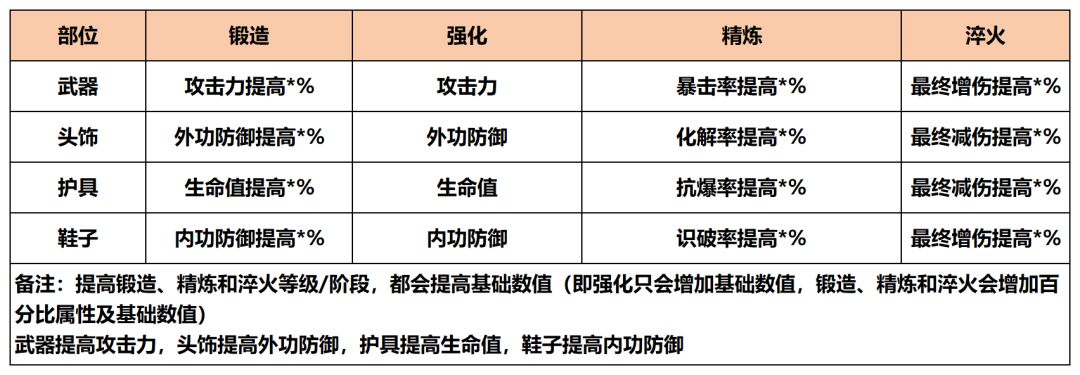 如上图示,武器可提升攻击力,头饰可提升外功防御,护具可提升生命值,鞋子可提升内功防御。锻造、精炼和淬火玩法在提升基础数值的基础上,还有提升相应属性的百分比。玩家要根据自己的阵容、侠客定位、装备特质来决定装备培养的优先级。