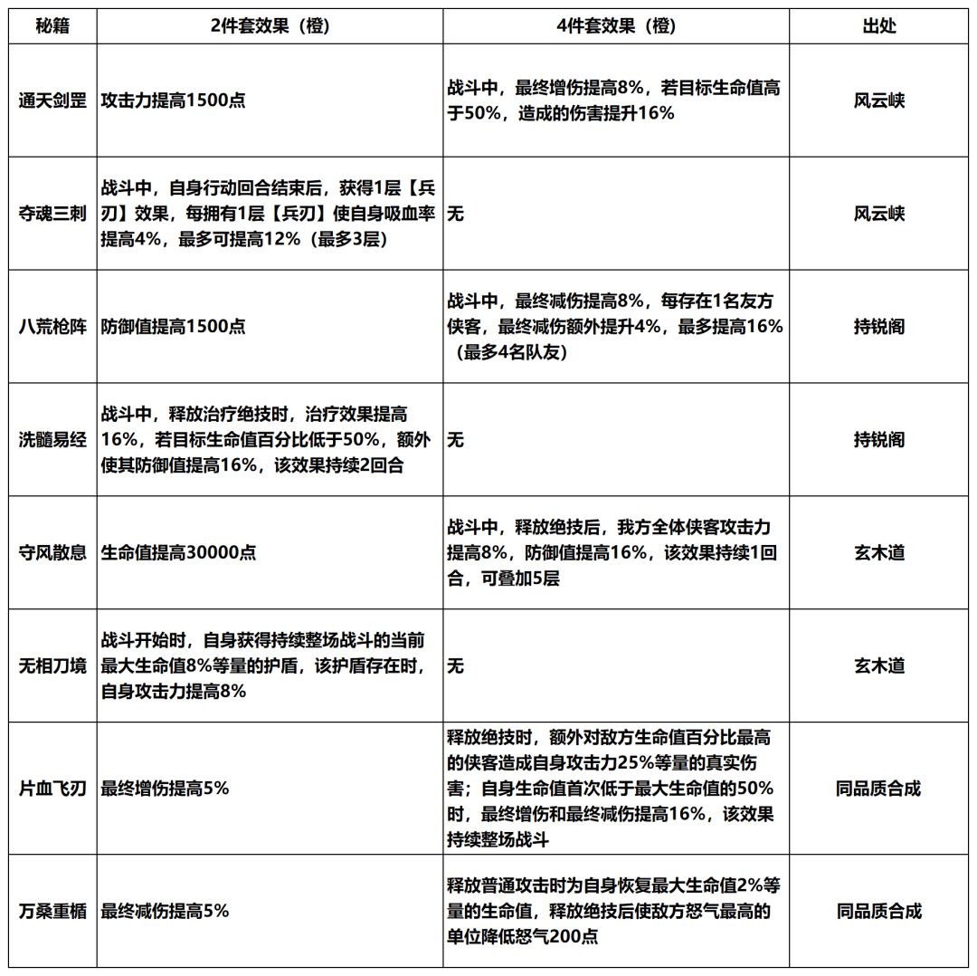 - 武林秘籍:穿戴若干件相应品质的秘籍,相对简单