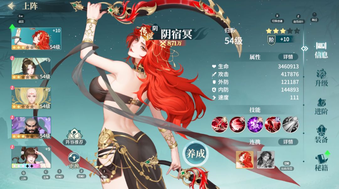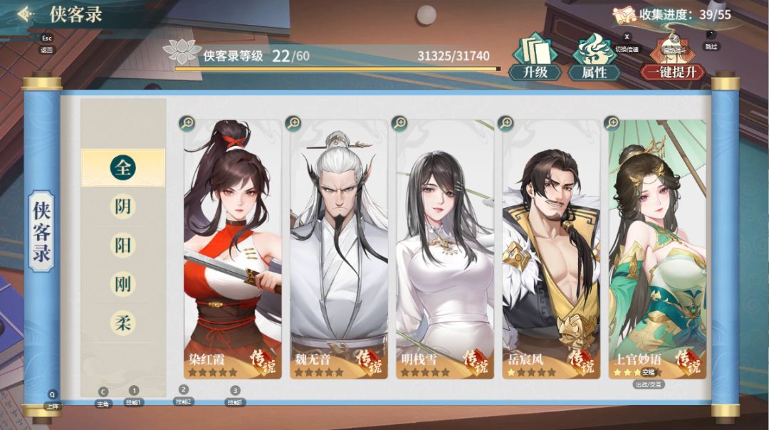 阵容养成的板块非常丰富,包括侠客养成(信息)、升级、进阶、装备、秘籍。