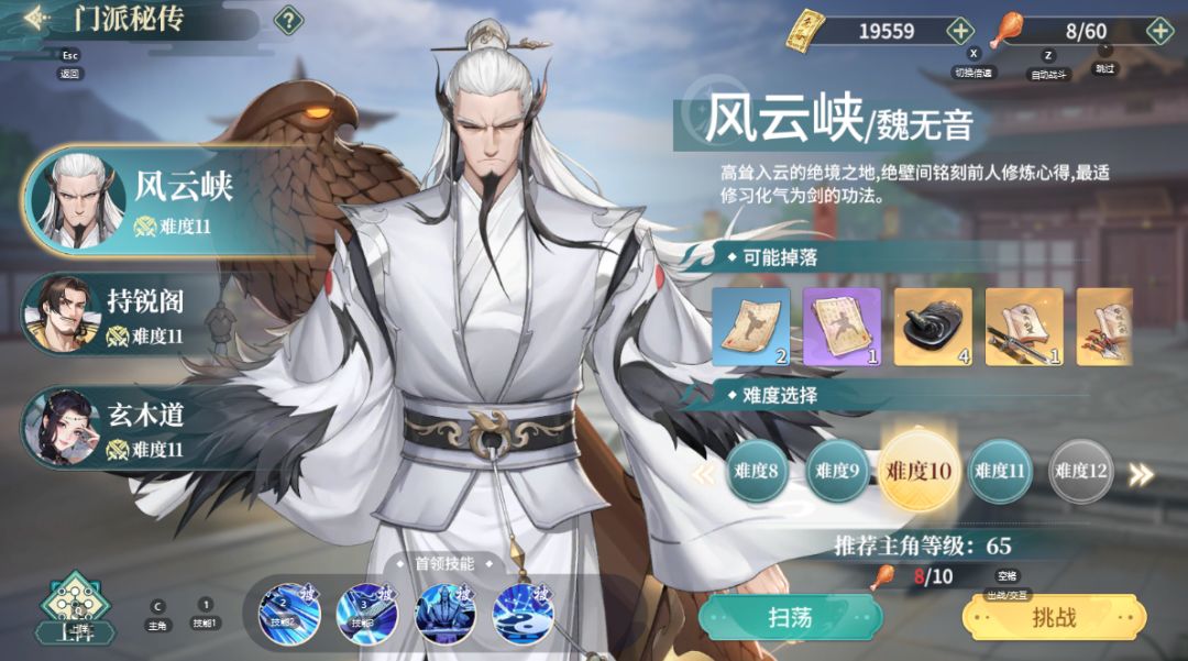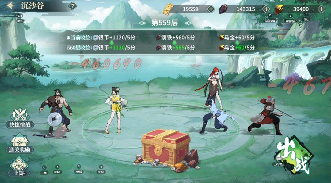 获得心法的主要渠道之一,每两天刷新一次,若通关,则刷新时进入下一难度并提升奖励。一共3大关,每个小关通关奖励心法+心法培养道具,大关通关后可以领宝箱。